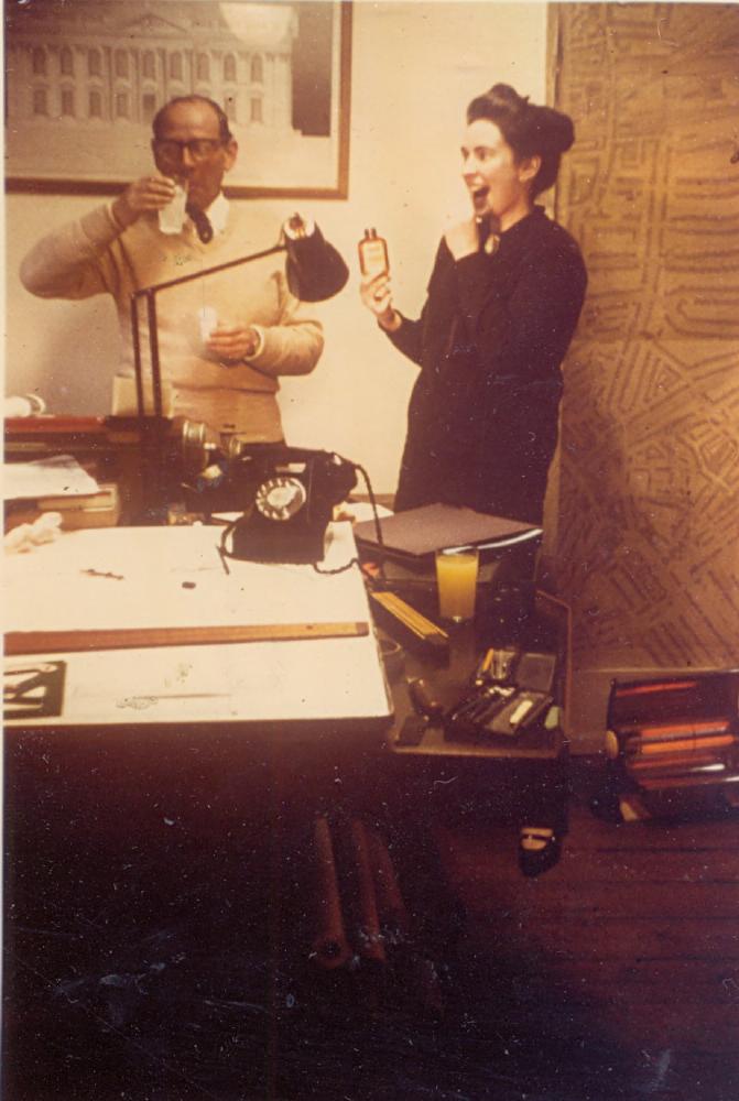 But what is going on? What is he drinking? What’s in the bottle? What’s the orange juice about – and who drank it in such large glasses fifty years ago? She’s clearly a little shocked as well as amused. And then there’s the caption – “drug-taking 1962” – neatly, if not fluently, lettered out between tram-lines the way architects do. Or is this a child’s hand? Clearly it’s a joke of some sort – but it’s joke that’s on me unless I can decipher more. And there’s a third person here – the presence of the hand wielding the camera (and not too many people taking home colour photographs at this date). The cameraman is always present to some extent in any photograph, but here it’s overwhelming. Who has caught this moment and carefully preserved it? What does it mean?