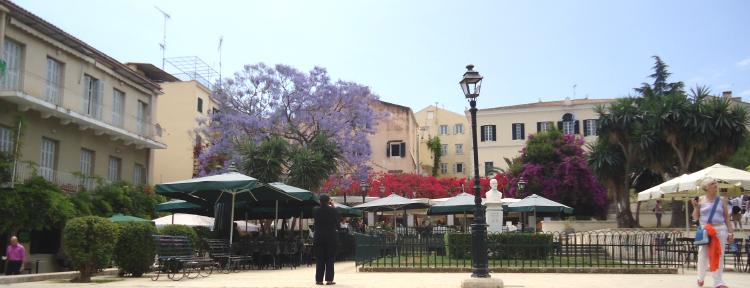 I return to Kapodistriou Street, where the Durrell family’s horse-drawn cab “shambled to a halt outside a doorway over which hung a board with Pension Suisse inscribed on it” all those years ago. And there we meet up for an excellent lunch in the square behind the town hall – the trees in flower (what is that lovely lilac one?) There’s even a wedding going on – oddly, an English wedding. We watch the photographs being taken outside the town hall. We watch the wedding party being seated a couple of tables away – but we can’t for the life of us figure out who it is that has just got married. It’s usually fairly obvious who the bride and groom are, but we had to ask in the end – and we had it all wrong. It was the nice young woman in the floral dress we asked who turned out to be the bride. Congratulations to her.