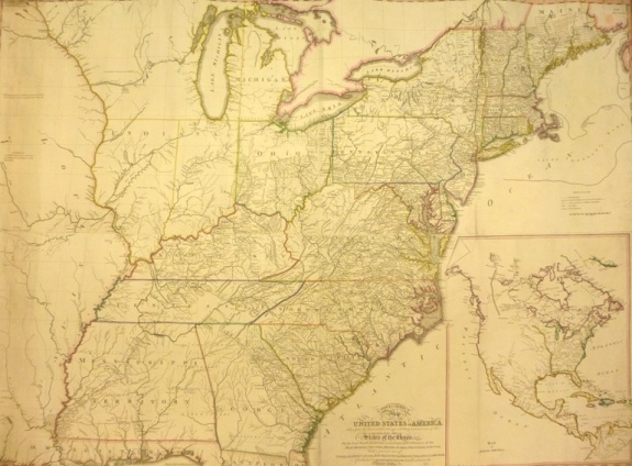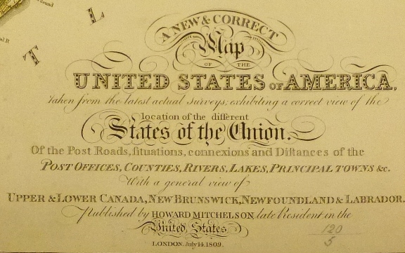 Well now – the faint echo of a challenge whispers across the blogosphere this week. The gentle laying down of a gauntlet. Over on the British Library’s excellent Maps and Views blog, in her post Celebrating George III: the Map King (29th January 2014), Kate Marshall reports a seemingly unrecorded cartographer: Howard Mitchelson, the publisher of this rare and handsome four-sheet map of the United States, published in London in 1809 – “Neither the British Library nor the Library of Congress catalogues list other maps by Mitchelson and his name does not appear in Tooley’s Dictionary of Mapmakers nor in British Map Engravers by Laurence Worms and Ashley Baynton-Williams”. She asks if anyone can shed light.