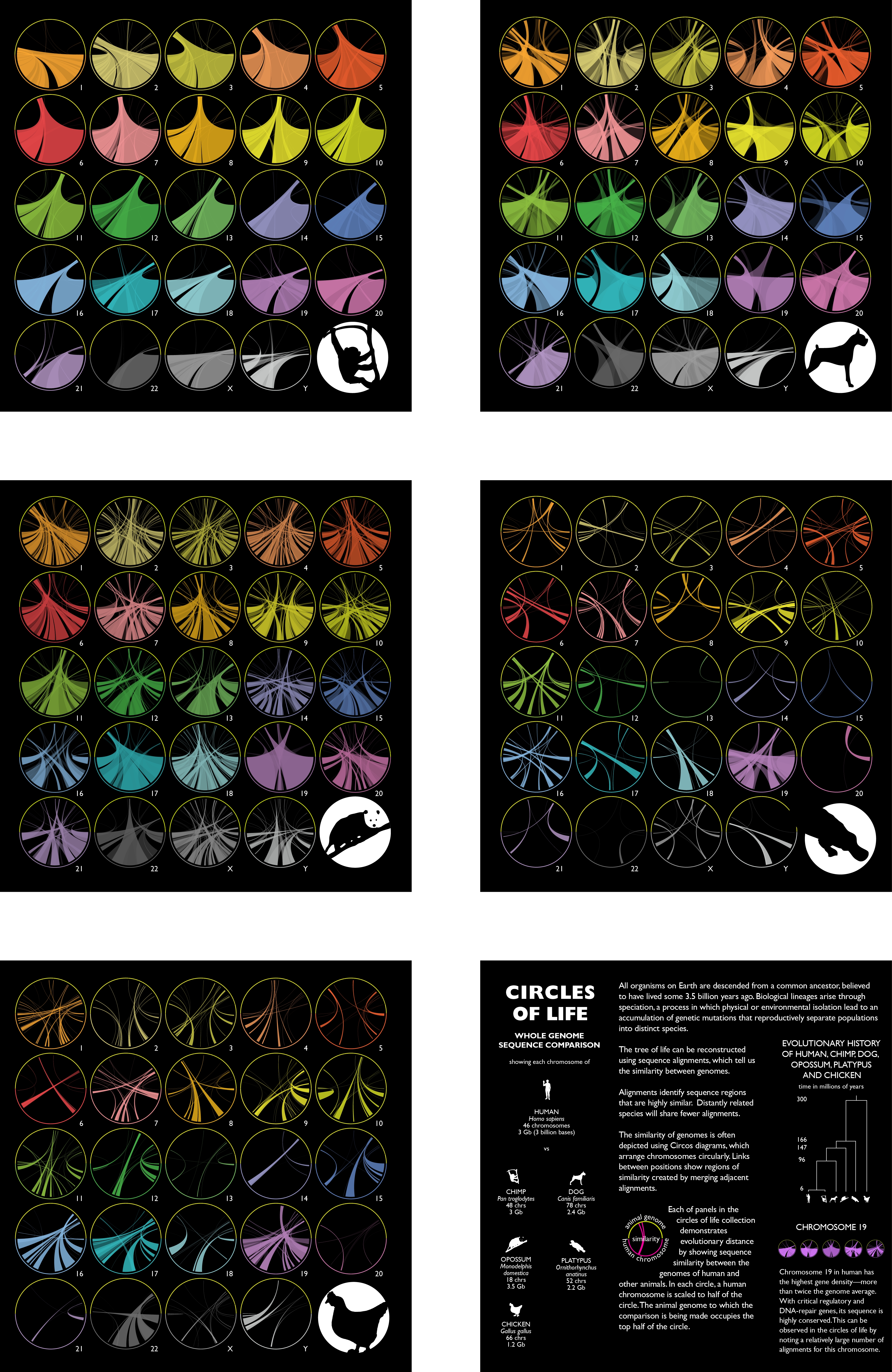 And bringing this right up to date we also had Martin Krzywinski ‘s Circles of Life (2014) showing the genome overlap between humans and various other species – chimps, dogs, chickens and whatever the hell the correct plural forms are for the opossum and the platypus – opossa? platypi?
