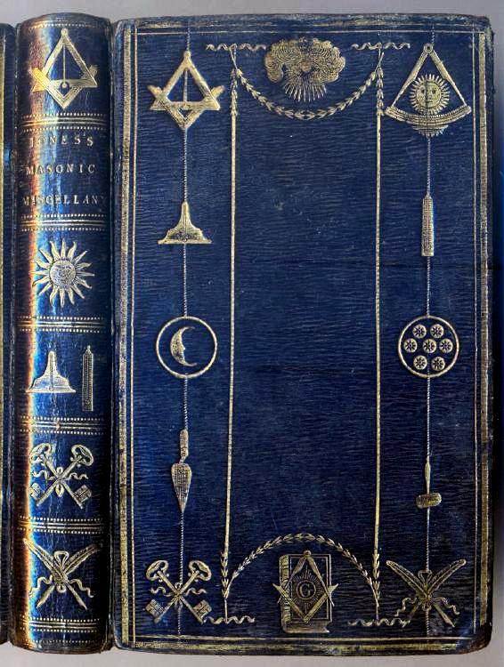 Out and about in the hilly hinterlands of South London this week – and very pleased to have picked this up at an auction. I suspect I’ve remarked before on how cheaply very good examples of English provincial bindings can still be bought: delighted to prove it with this lovely masonic binding of about 1800. The book is Stephen Jones’ Masonic Miscellanies – the 1797 first edition: uncommon enough in itself, no copies at all of the first edition currently listed for sale on the internet, although not truly rare. The ESTC locates five copies in UK institutions and others in the USA – but a copy bound in a beautifully appropriate contemporary masonic binding by a known binder? Yes, truly rare and quite possibly unique.