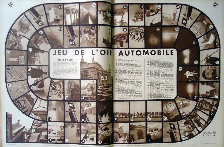 Nor was this Adrian’s only purchase of the day: arriving at about the same time as we did was this delightful game in a 1933 issue of the French magazine Vu. For all its twentieth-century trappings of automobiles and sharp photography, it’s a traditional Game of the Goose – the death-square here in the form of a caped gendarme ready to inflict dire consequences on speeding or careless motorists (and even a suggestion of paradise as a giant car-park).