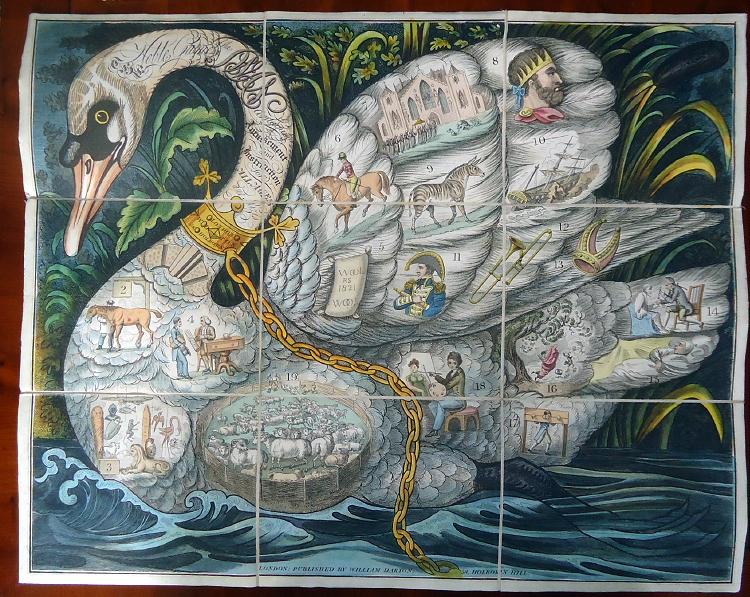 I was very pleased to be able to add this magnificent beast to the collection – William Darton’s 1821 Noble Game of the Swan. An example of the game with a pleasant little history of its own: it once belonged to Percy Muir, ABA President in 1946-1947, and was item No. 961 in Muir’s catalogue of the National Book League’s May 1946 exhibition of Children’s Books of Yesterday. It was a ground-breaking exhibition, with the foresight to include games, puzzles and peep-shows, and the present game not only still has its beautifully hand-coloured card case, but its printed rules and even its 1946 exhibition label.