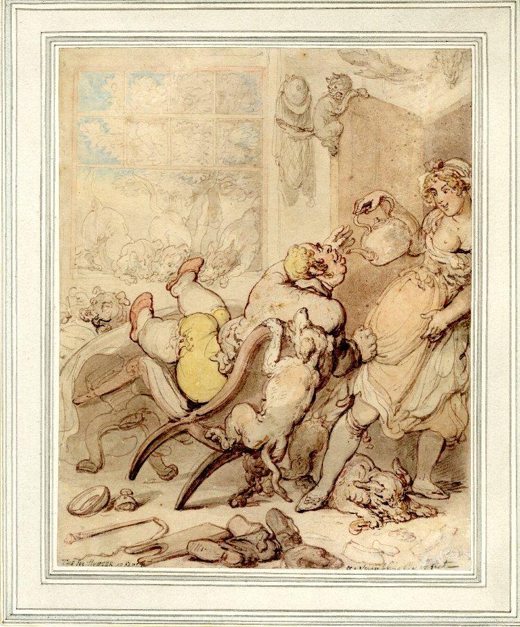 The Fox Hunter at Fault or a Scrambling Breakfast – a sketch by Thomas Rowlandson from the Rose Collection. © Trustees of the British Museum.