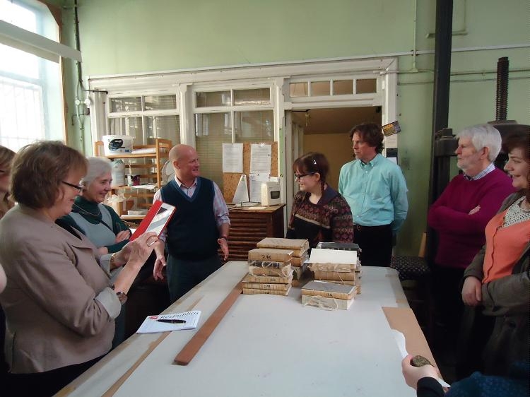 A very pleasant afternoon out in Bath last week – an outing with a group of rare book librarians for a special behind-the-scenes tour of the famous Bayntun-Riviere bindery at George Bayntun’s on Manvers Street. The tour was arranged as part of an ongoing let’s-get-to-know-each-other-better series of exchange visits between the booksellers of the ABA and the librarians of the Rare Books and Special Collections Group of the Chartered Institute of Library and Information Professionals (CILIP).