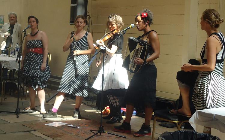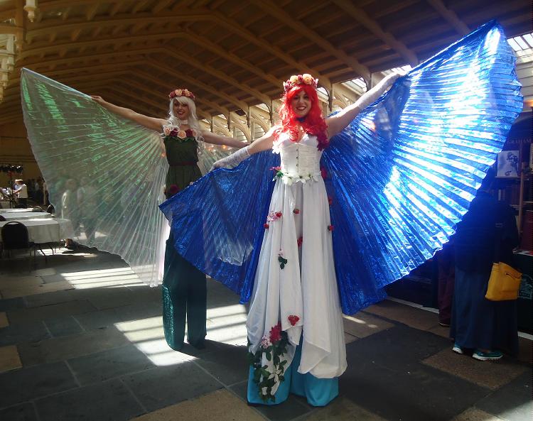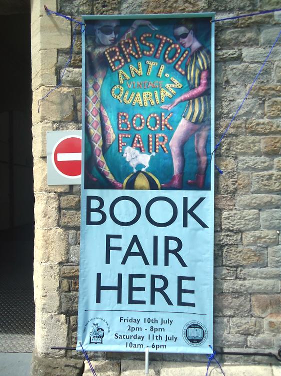 Different customs. Here I am enjoying the sunshine at the Bristol Book Fair last weekend (doing “that weird European sun thing you do”, as he puts it). I’ve been to some book-fairs before, but this was my first outside London – and the first to which I could bring my freshly-trained and slightly more professional eye. A bit startled by the women on stilts who greeted us with a flurry of twirls – wasn’t expecting that. Managed eventually to navigate Laurence past them (he was clearly rather taken) and start looking at some books. There was live jazz music in the background by now – more on that later.