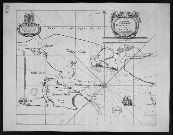 John Seller at the outset of his career, already with a reputation as an instrument-seller, and perhaps also selling platts and Dutch-produced waggoners. We tend only to think of Seller in terms of printed charts, but let me show you this: a Thames-School manuscript chart of Bombay – by John Seller. This one undated, but there are two similar ones in the same collection, both dated 1684.