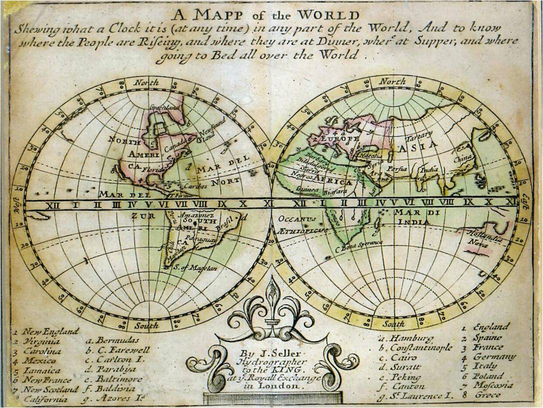 John Seller, A Mapp of the World. [ca.1684]. “A mapp of the world shewing what a clock it is (at any time) in any part of the world, and to know where the people are riseing, and where they are at dinner, where at supper, and where going to bed all over the world”.