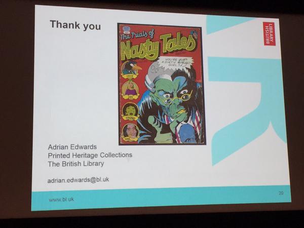 As a concrete example, Adrian Edwards (Lead Curator of Printed Historical Sources at the BL) was the first speaker of the day, referring back to last year’s ‘Comics Unmasked’ exhibition (see the post of that name from 1st May 2014). His theme was the uncovering of the treasure-trove of comics of all kinds that the British Library had acquired in one way or another over the years, but more or less hidden away – largely uncatalogued, ill-catalogued or otherwise inaccessible. He was able to use the potential for mounting a major international exhibition to leverage the resources (always in short supply) to get the comics sorted out, properly catalogued, and made available for essentially the first time, calling in outside experts to advise on the exhibition.
