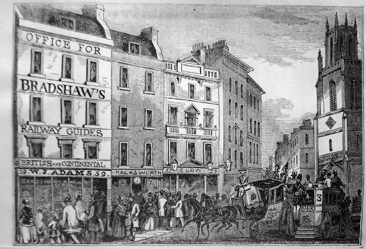 The frontispiece is captioned “Fleet-Street and St. Dunstan’s West. – Mid-Day” (although the clock outside the watchmaker William Halksworth’s premises, next door to Adams, is very far from mid-day). It was engraved by ‘Delamotte’ –Freeman Gage Delamotte of Red Lion Square – a regular contributor to Adams’ publications, but it is the publisher William James Adams (1807-1873) himself who interests me. He is the almost wholly forgotten man behind the story of Bradshaw’s Railway Guides – those indispensible handbooks which so informed the travel and coloured the imagination of generations of British readers.