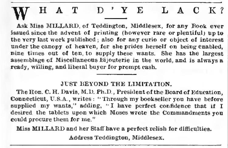Actually, I have had my eye on Clara Millard for some considerable time.  Hers was a name that kept cropping up as I scoured contemporary directories looking for the late nineteenth-century book-trade in my “Book-Hunters of 1888” series of posts.  She stood out, not because she was a woman – there were other women booksellers in London – Lily Cancellor in Chelsea, Mrs Grose in Panton Street, Mrs Kettle in Camden Passage, Mrs Pepper in Lambeth, Clara Simmonds in Mile End, Mary Lee Tregaskis (who was a bookseller long before her husband ever was), Mrs Winn in Wych Street, others no doubt sheltered behind initials rather than forenames – but Clara Millard’s assertive advertisements had a kind of bravura uncommon in the book-trade.  When it comes to the books you are looking for, “Miss Millard has scratched the word ‘impossible’ out of her dictionary”.