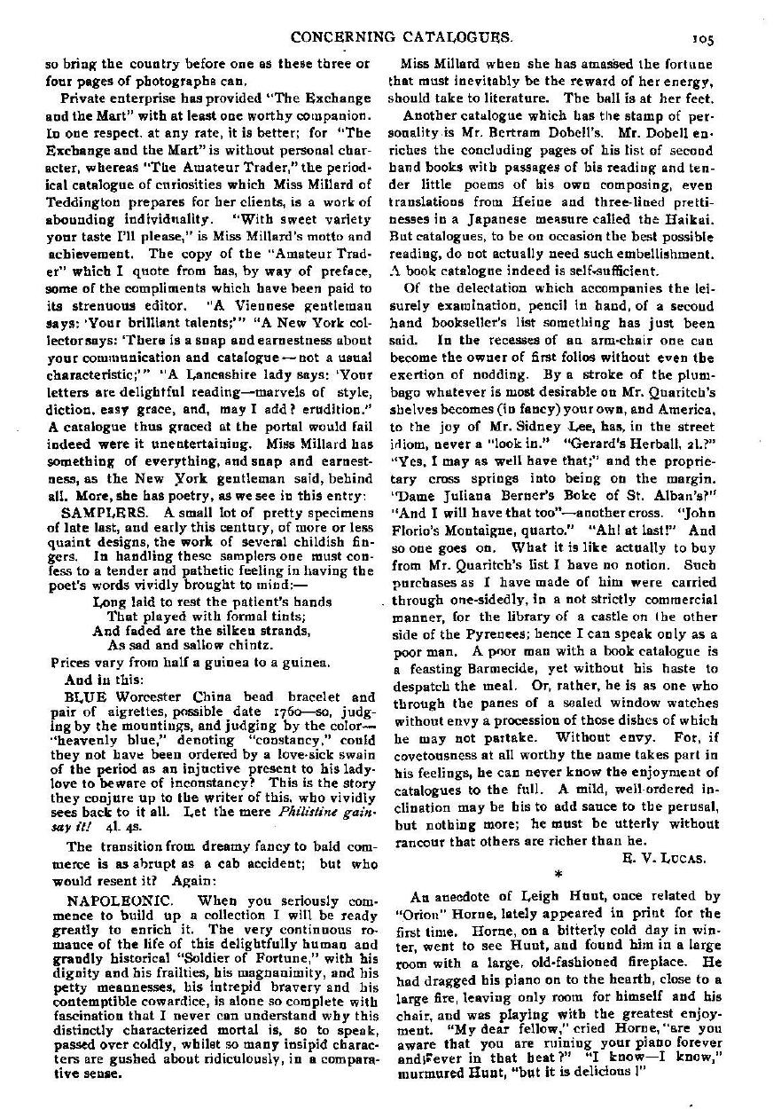 Her advertising is a joy – someone should anthologise it.  Her cataloguing was much admired: the “London Daily News” (3rd December 1895) found it “vigorous” and especially liked the “flowery components” – “In describing her treasures, the lady shows the great critical faculty of zest.  She writes about a miniature, or a piece of lace, as Hazlitt wrote about a fives match, or a prize fight, ‘as if she loved it’”.  As distinguished a prose stylist as E.  V.  Lucas could write that “when she has amassed the fortune that must inevitably be the reward of her energy, [she] should take to literature” (“The Book-Lover”, 1900).  You can read the rest of this passage, in which she takes top billing over Quaritch and Dobell, by enlarging the image.  And she had other famous fans: Baron Friedrich Von Hügel sent a reading list to Maude Petre from Florence in 1899, adding in a postscript that, “There is a Miss Clara Millard, Teddington, Middlesex, who is a professional book-hunter.  She would get you any or all of those old books referred to above, with astonishing quickness, and would not (I hope) charge too much.  Through ordinary booksellers you might have to wait months – years perhaps”.  A testimonial from the United States in 1901 declared, “I have perfect confidence that if I desired the tablets upon which Moses wrote the Commandments you could procure them for me”.  She advertised that as only just beyond the limitation of her powers.