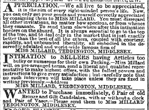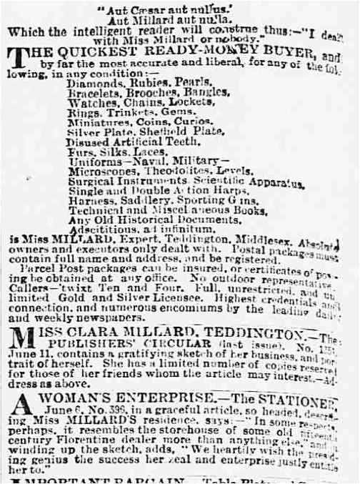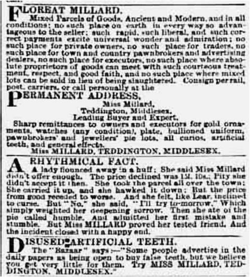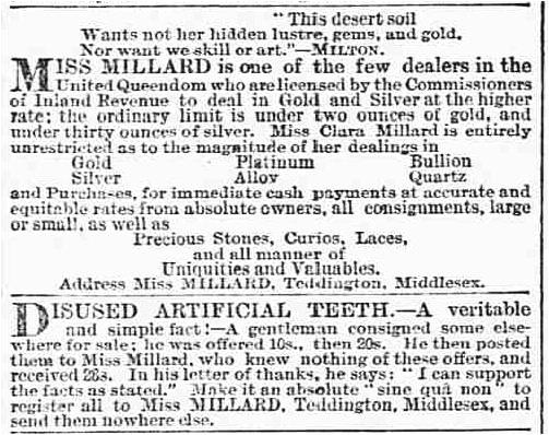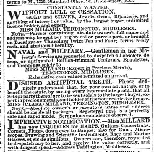Gradually the offers of goods for sale in the newspapers were replaced by requests for fresh stock.  These became omnivorous, voracious, all-devouring, relentless, and appeared “without lull or cessation” (although anything which did not pass muster was sent straight back).  Here’s a typical appeal from 1888: “ENQUIRY.  – PLEASE RESPOND.  – Have you any old-fashioned, unwearable jewellery or damaged modern ornaments in gold or silver, silver and Sheffield plate, curios, coins, nic-nacs, artificial teeth, laces, silks, velvets, satins, furs, tapestries, crewels, collections of postage stamps, miniatures, paste articles, books, or anything possessing value or merit? Then for higher prices than elsewhere send them to me per post, rail, or carrier, and in a few hours afterwards you shall have the money to accept or reject, or bring them down personally, between ten and four.  Clara (Miss) Millard, Mulberry House, Teddington, Middlesex” (Morning Post, 15th November 1888).  By 1893 she could state unequivocally that she was “simply the best buyer and the quickest payer in the world for gold, silver, jewels, curios, laces, velvets, buttons, down to artificial teeth” (London Evening Standard, 14th September 1893).  She was particularly keen on artificial teeth (presumably for their scrap value) and often advertised separately for those.