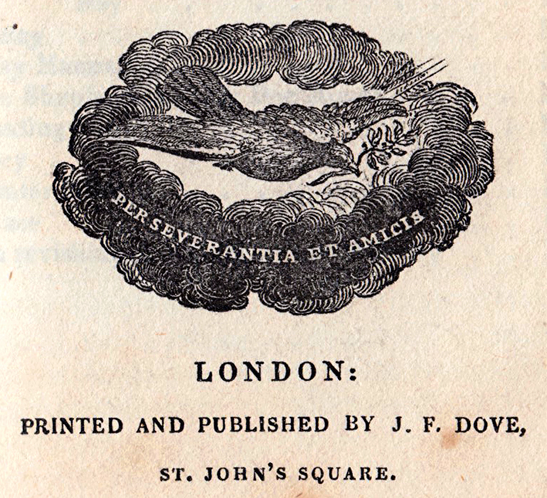 As for Dove himself, he was born 20th October 1787 and baptised on the 18th November of that year at the local church of St. Gregory at Sudbury, in Suffolk – the son of Humphry Dove and his wife Ruth Yardley. He was apprenticed into the Stationers’ Company in 1803 and was active as a printer in Clerkenwell in his own right from at least as early as 1813, probably earlier. There he remained for the next twenty years, although he briefly had additional premises on Piccadilly either side of 1830.