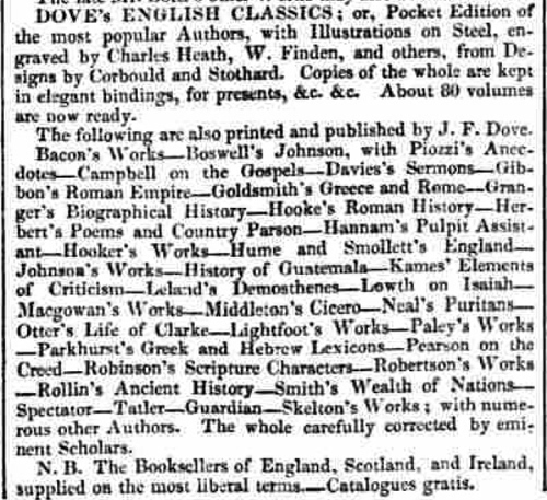 Thank you so much for this. Yes – I think this must be right, that Dove took over the rights in the existing “Walker” series – probably in two stages: the first involving changing the series title to his own, but still printing on behalf of the “Proprietors”, and then subsequently acquiring the full rights and (in about 1827) commencing to publish solely under his own name.