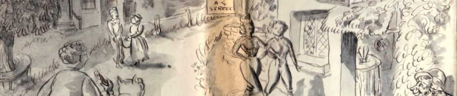 But it once meant enough to someone to spend time, trouble, and no little skill in fashioning a personal and artistic tribute in the form of this hand-made jacket. As an image, it seems to reflect the rustic spirit and themes of the novel rather than relate to any particular incident – although the elderly couple in the centre must be the Ferrises, young Phoebe Carpenter’s mentors both in farming and life, and the flighty land-girls outside the pub are recognisable enough.
