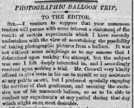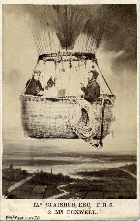 Among the instruments they made were some for the great aeronauts of the day, Henry Tracey Coxwell (1819-1900) and James Glaisher (1809-1903) — instruments for measuring the temperature, density, and humidity of the atmosphere at altitude — which Negretti would install and calibrate before take-off. In 1863, he himself became the first man to take aerial photographs from a balloon in flight — an entertaining account of which he sent to the press. Coxwell’s mammoth balloon, the car converted to a dark-room, was launched from the gas-works at Sydenham. The photographs admittedly left “quelque chose à desirer” — in Negretti’s phrase — but “it had been demonstrated that photographic views can be taken at elevations ranging from 3,000 to 6,000 feet from the ground” (London Evening Standard,1st June 1863).