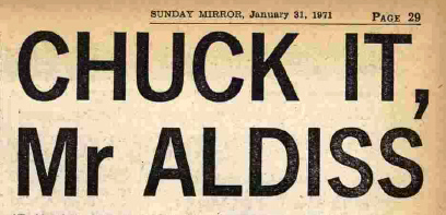 The Sunday Mirror too back then took books seriously, albeit in a different way. Frederick Forsyth was given feature treatment on the eve of publication of The Day of the Jackal, while in another pre-publication feature (on The Female Eunuch), Quentin Crewe began “Feminists have always seemed to me to be particularly repulsive … until I met Germaine Greer”. Crewe’s colleague, Ian Khan, later headlined a review of Brian Aldiss’s controversial A Soldier Erect with “Chuck It, Mr Aldiss”. To its credit, the newspaper afforded the affronted author ample space to reply in a dignified letter the following week: ““I’m sorry that Mr Kahn (last Sunday) found my new novel … tedious and nasty. War often is tedious and nasty”.