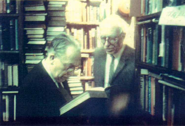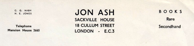 It became a date easy to remember. It was on my twenty-third birthday that I first met Hugh Ernest Jones (1895-1980) — on the right of the photograph — and Cyril Gordon Nash (1899-1982), on the left. They traded as “Jon Ash”, a topping-and-tailing of their names they had first used in a play they had written together before the war (set in a South London bookshop). Their shop in Cullum Street (between Fenchurch Street and Leadenhall Market) was a small one, not much more than a spacious cupboard with an odd hind-leg, the front window turned in on itself to face the passage into the shop rather than the street. The portion of the window actually fronting the street was just twenty-three inches (58cm) across. I walked right past it without seeing it the first time.